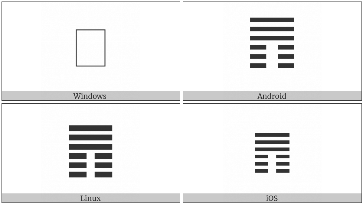 The image below shows how the “Hexagram For Standstill” symbol might look like on different operating systems. If the font in which this web site is displayed does not contain the symbol and there is no fallback font able to render it, you can use the image below to get an idea of what it should look like.
