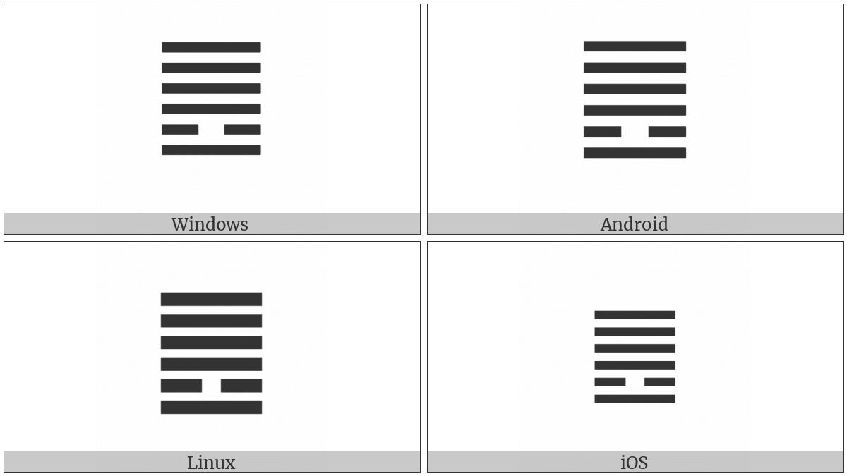 The image below shows how the “Hexagram For Fellowship” symbol might look like on different operating systems. If the font in which this web site is displayed does not contain the symbol and there is no fallback font able to render it, you can use the image below to get an idea of what it should look like.