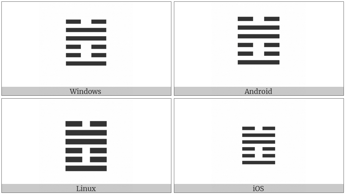 The image below shows how the “Hexagram For Following” symbol might look like on different operating systems. If the font in which this web site is displayed does not contain the symbol and there is no fallback font able to render it, you can use the image below to get an idea of what it should look like.
