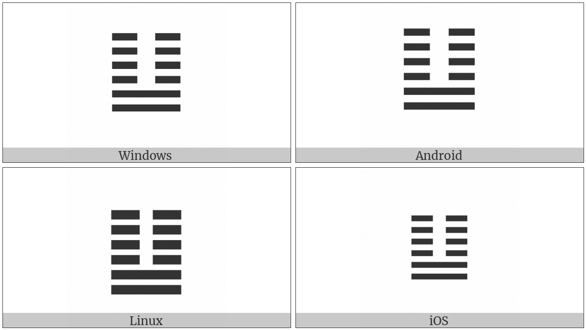 The image below shows how the “Hexagram For Approach” symbol might look like on different operating systems. If the font in which this web site is displayed does not contain the symbol and there is no fallback font able to render it, you can use the image below to get an idea of what it should look like.