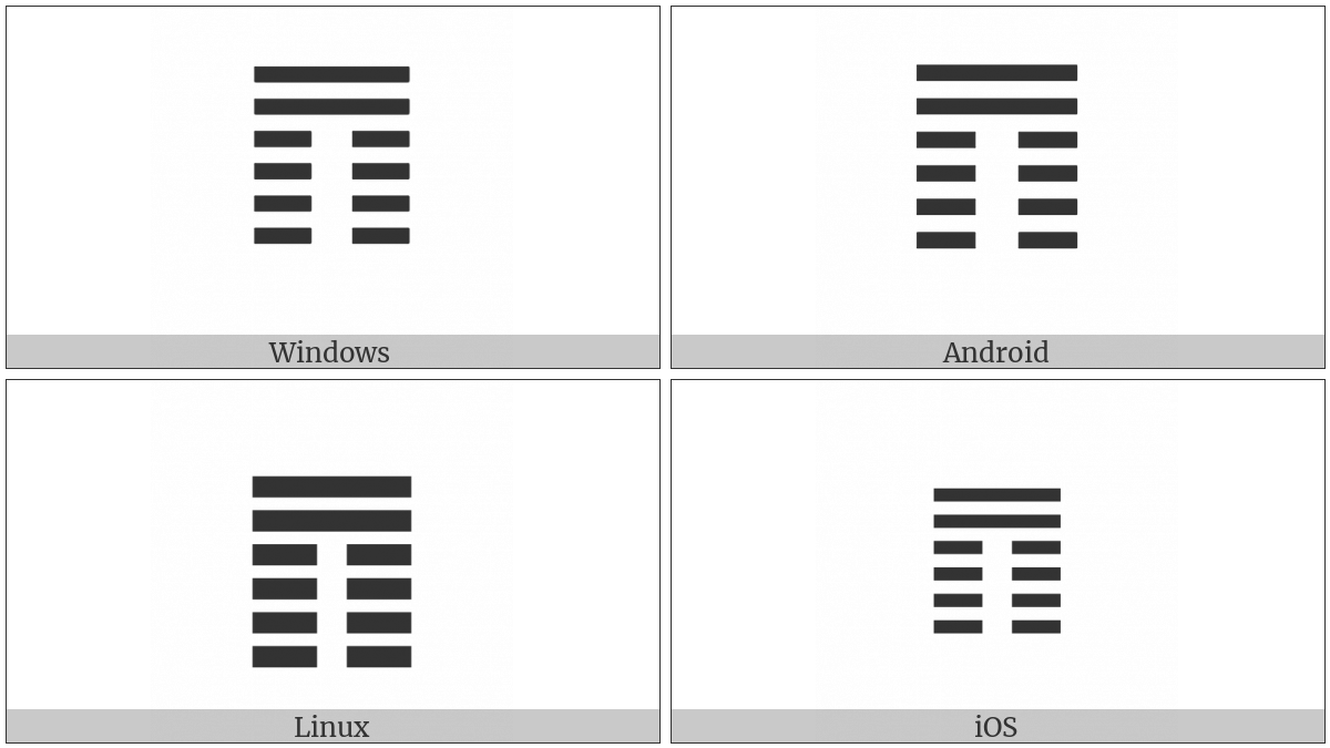 The image below shows how the “Hexagram For Contemplation” symbol might look like on different operating systems. If the font in which this web site is displayed does not contain the symbol and there is no fallback font able to render it, you can use the image below to get an idea of what it should look like.