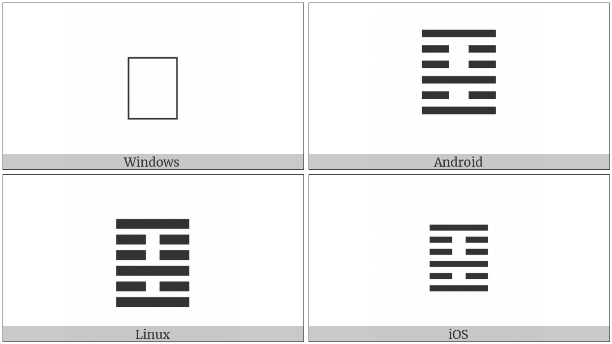 The image below shows how the “Hexagram For Grace” symbol might look like on different operating systems. If the font in which this web site is displayed does not contain the symbol and there is no fallback font able to render it, you can use the image below to get an idea of what it should look like.