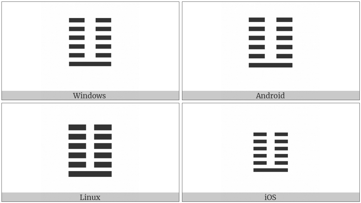 The image below shows how the “Hexagram For Return” symbol might look like on different operating systems. If the font in which this web site is displayed does not contain the symbol and there is no fallback font able to render it, you can use the image below to get an idea of what it should look like.