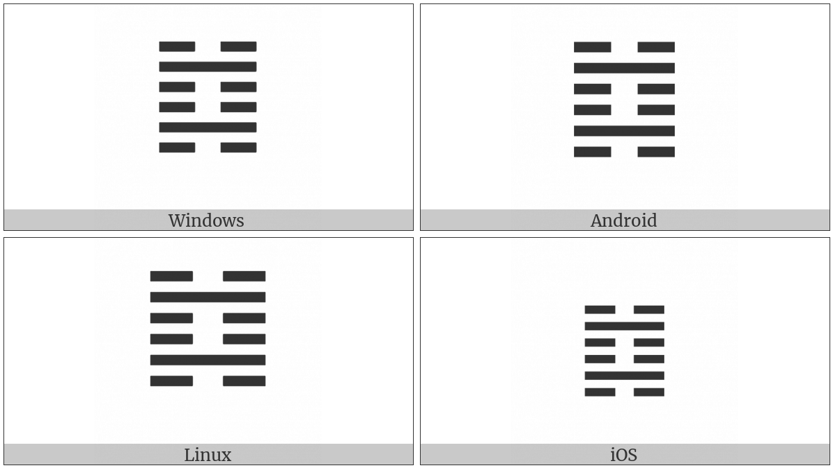 The image below shows how the “Hexagram For The Abysmal Water” symbol might look like on different operating systems. If the font in which this web site is displayed does not contain the symbol and there is no fallback font able to render it, you can use the image below to get an idea of what it should look like.