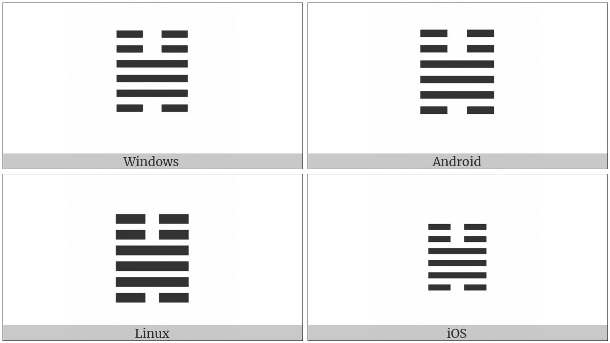 The image below shows how the “Hexagram For Duration” symbol might look like on different operating systems. If the font in which this web site is displayed does not contain the symbol and there is no fallback font able to render it, you can use the image below to get an idea of what it should look like.