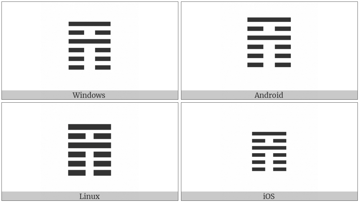 The image below shows how the “Hexagram For Progress” symbol might look like on different operating systems. If the font in which this web site is displayed does not contain the symbol and there is no fallback font able to render it, you can use the image below to get an idea of what it should look like.