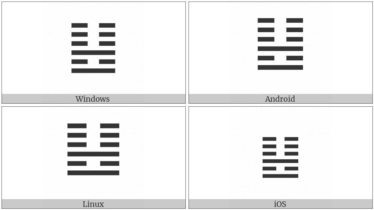 The image below shows how the “Hexagram For Darkening Of The Light” symbol might look like on different operating systems. If the font in which this web site is displayed does not contain the symbol and there is no fallback font able to render it, you can use the image below to get an idea of what it should look like.