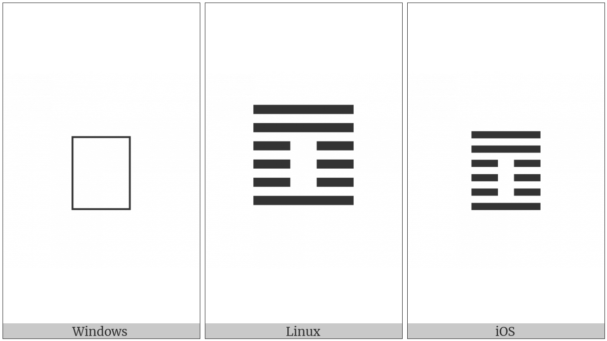 The image below shows how the “Hexagram For Increase” symbol might look like on different operating systems. If the font in which this web site is displayed does not contain the symbol and there is no fallback font able to render it, you can use the image below to get an idea of what it should look like.