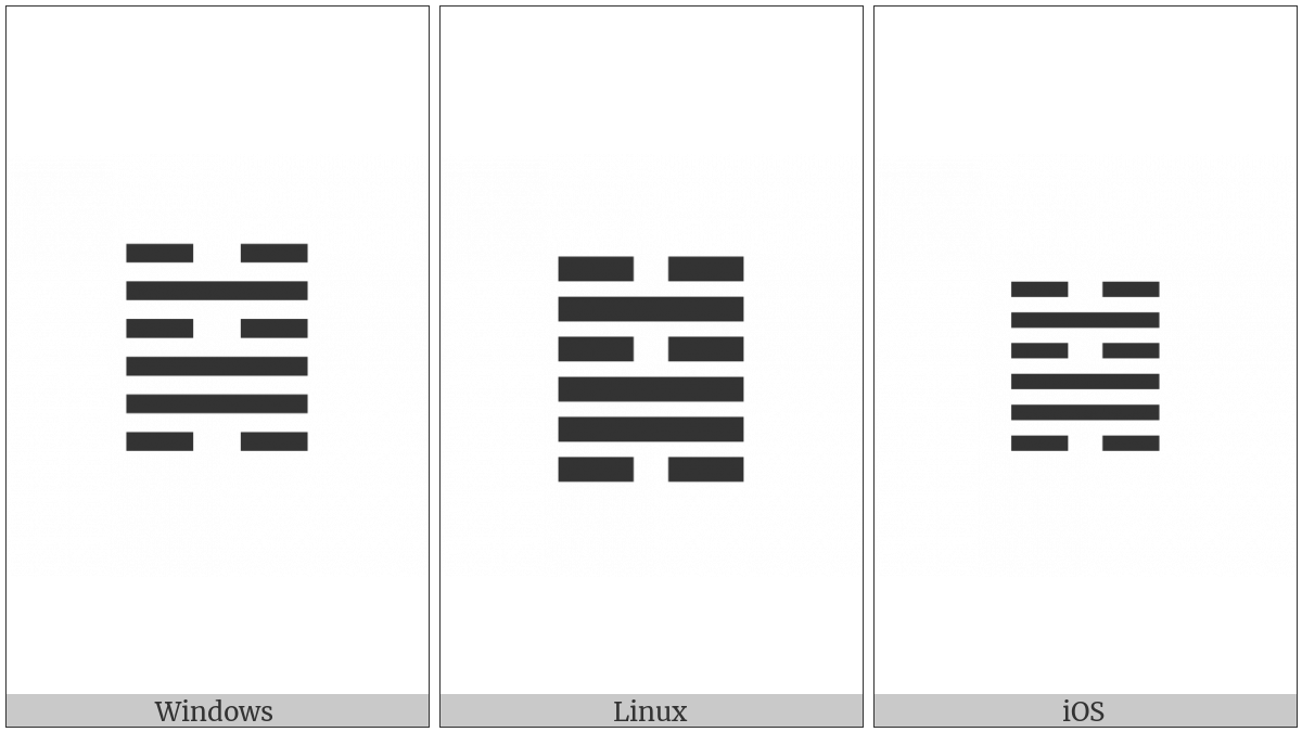 The image below shows how the “Hexagram For The Well” symbol might look like on different operating systems. If the font in which this web site is displayed does not contain the symbol and there is no fallback font able to render it, you can use the image below to get an idea of what it should look like.