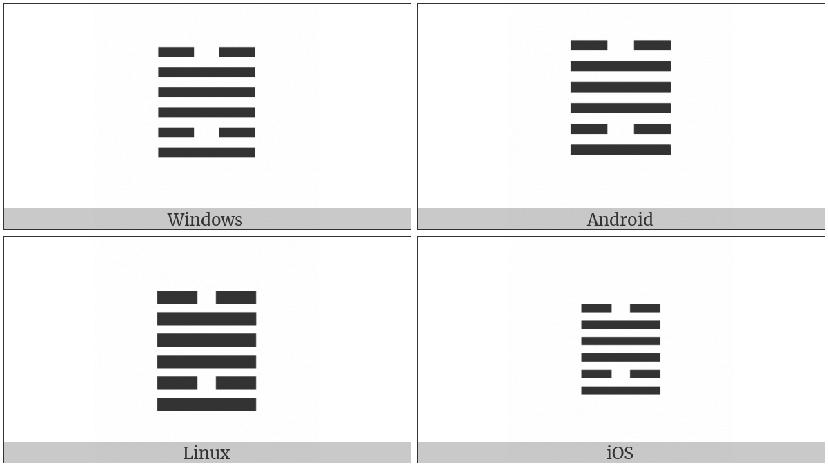 The image below shows how the “Hexagram For Revolution” symbol might look like on different operating systems. If the font in which this web site is displayed does not contain the symbol and there is no fallback font able to render it, you can use the image below to get an idea of what it should look like.