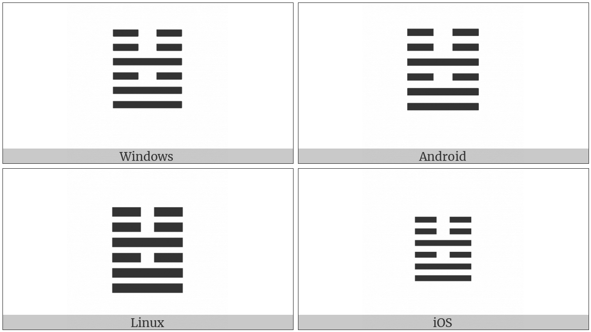 The image below shows how the “Hexagram For The Marrying Maiden” symbol might look like on different operating systems. If the font in which this web site is displayed does not contain the symbol and there is no fallback font able to render it, you can use the image below to get an idea of what it should look like.