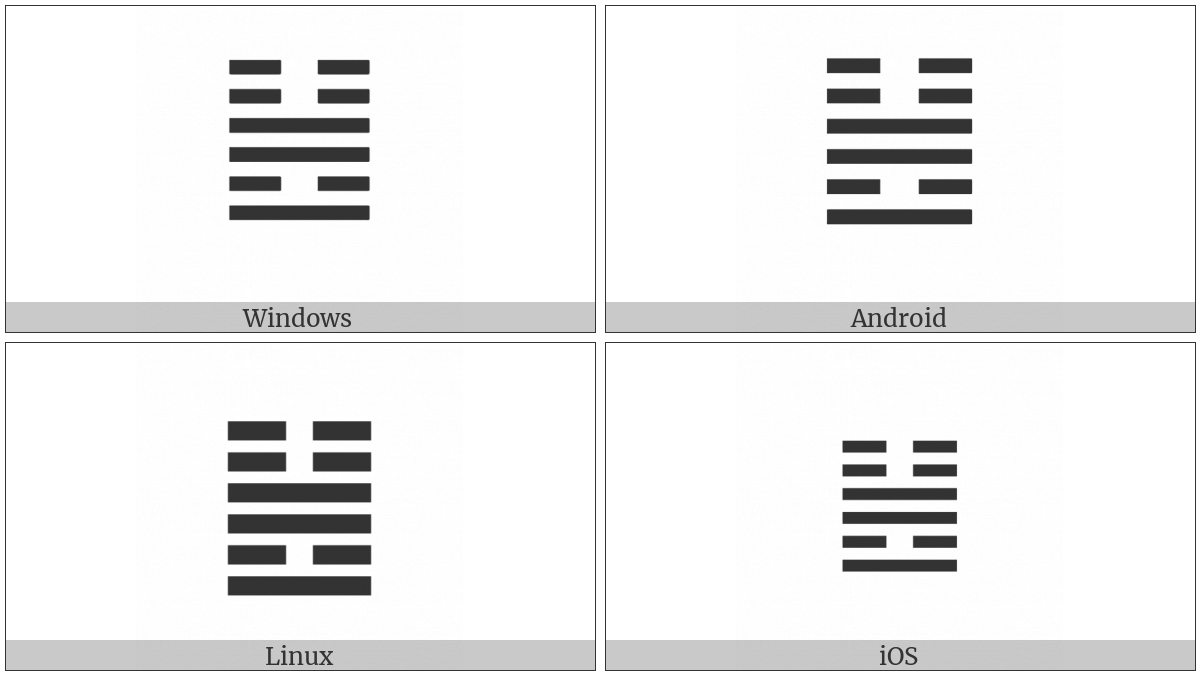 The image below shows how the “Hexagram For Abundance” symbol might look like on different operating systems. If the font in which this web site is displayed does not contain the symbol and there is no fallback font able to render it, you can use the image below to get an idea of what it should look like.