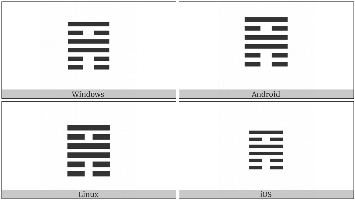 The image below shows how the “Hexagram For The Wanderer” symbol might look like on different operating systems. If the font in which this web site is displayed does not contain the symbol and there is no fallback font able to render it, you can use the image below to get an idea of what it should look like.