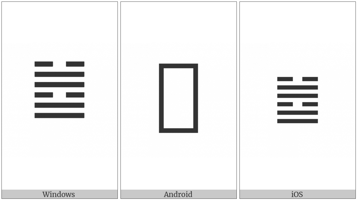 The image below shows how the “Hexagram For The Joyous Lake” symbol might look like on different operating systems. If the font in which this web site is displayed does not contain the symbol and there is no fallback font able to render it, you can use the image below to get an idea of what it should look like.