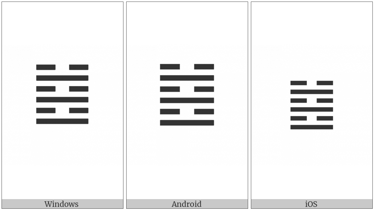 The image below shows how the “Hexagram For After Completion” symbol might look like on different operating systems. If the font in which this web site is displayed does not contain the symbol and there is no fallback font able to render it, you can use the image below to get an idea of what it should look like.