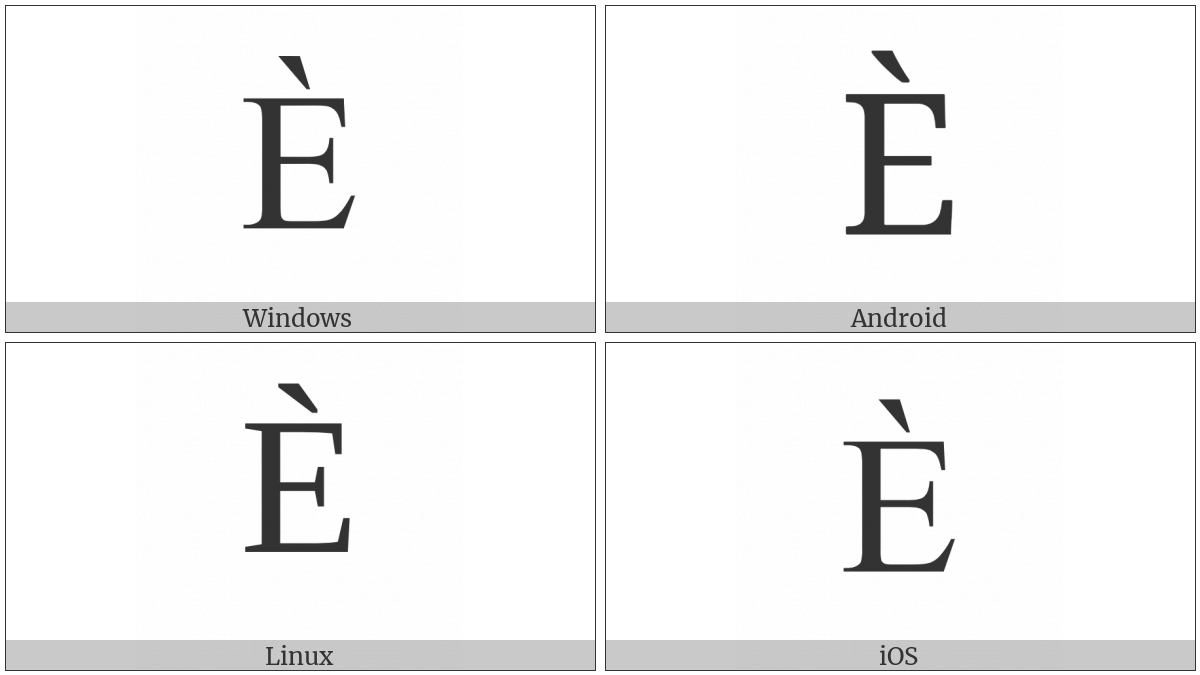 The image below shows how the “Latin Capital Letter E With Grave” symbol might look like on different operating systems. If the font in which this web site is displayed does not contain the symbol and there is no fallback font able to render it, you can use the image below to get an idea of what it should look like.