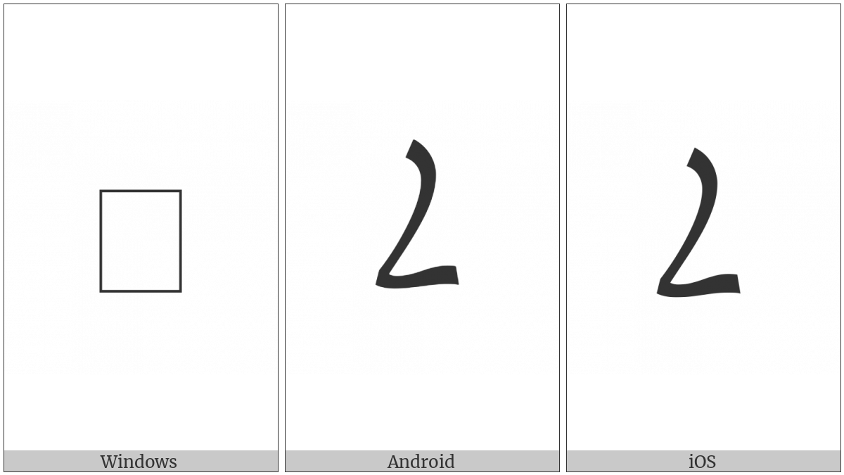 The image below shows how the “Samaritan Letter Labat” symbol might look like on different operating systems. If the font in which this web site is displayed does not contain the symbol and there is no fallback font able to render it, you can use the image below to get an idea of what it should look like.