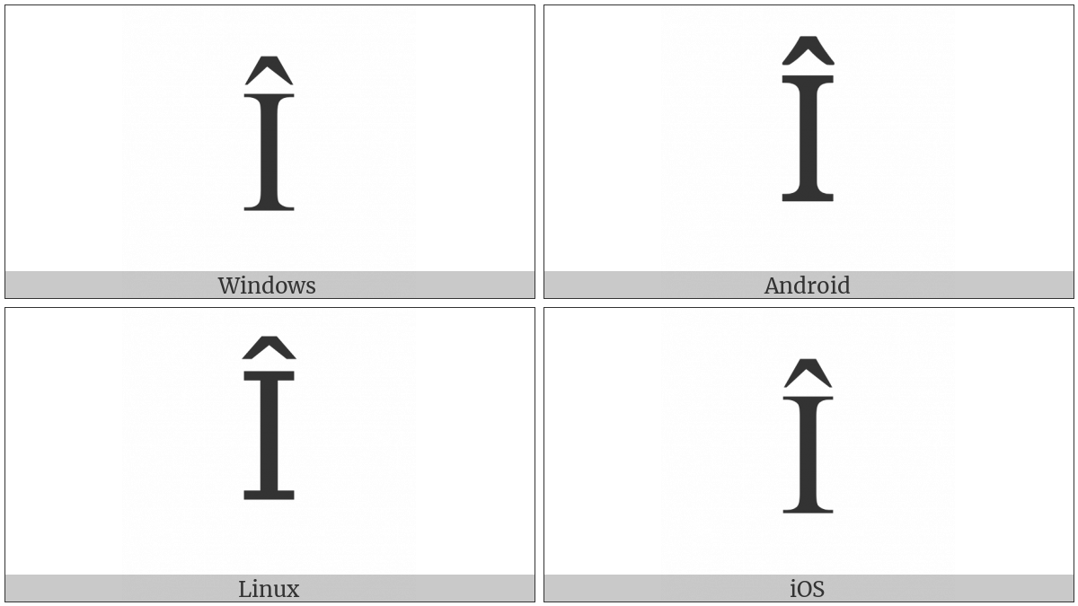 The image below shows how the “Latin Capital Letter I With Circumflex” symbol might look like on different operating systems. If the font in which this web site is displayed does not contain the symbol and there is no fallback font able to render it, you can use the image below to get an idea of what it should look like.