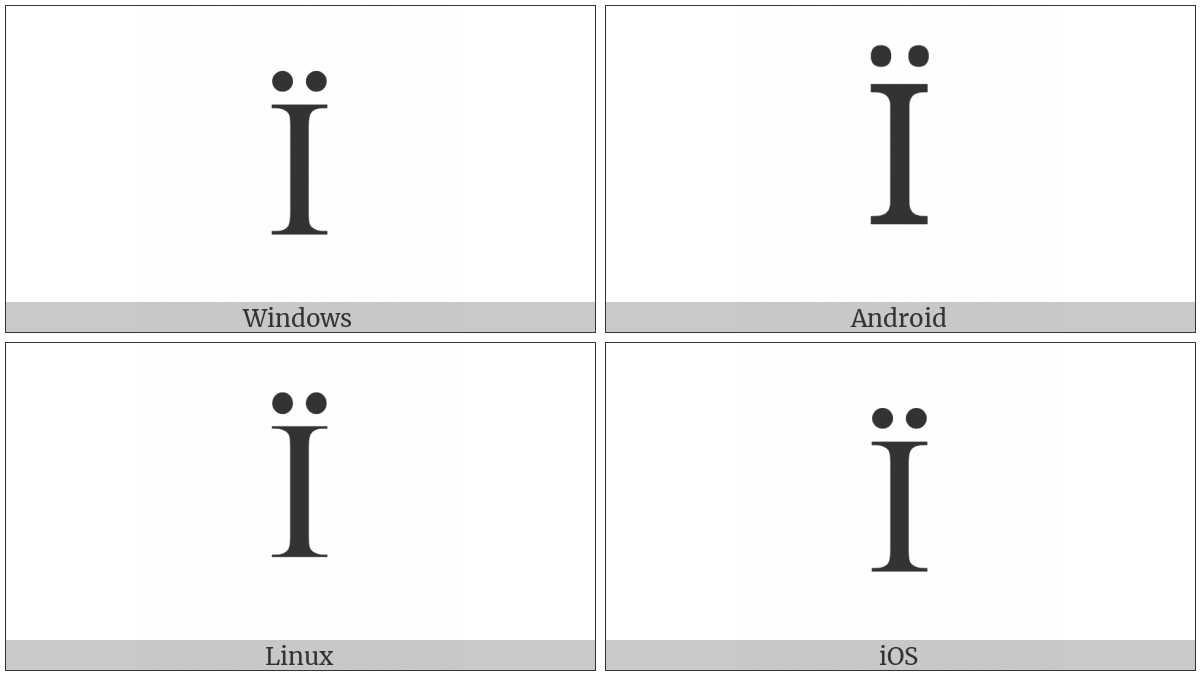 The image below shows how the “Latin Capital Letter I With Diaeresis” symbol might look like on different operating systems. If the font in which this web site is displayed does not contain the symbol and there is no fallback font able to render it, you can use the image below to get an idea of what it should look like.
