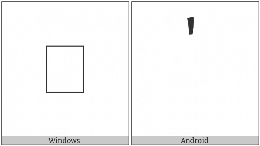 The image below shows how the “Samaritan Vowel Sign Long Aa” symbol might look like on different operating systems. If the font in which this web site is displayed does not contain the symbol and there is no fallback font able to render it, you can use the image below to get an idea of what it should look like.