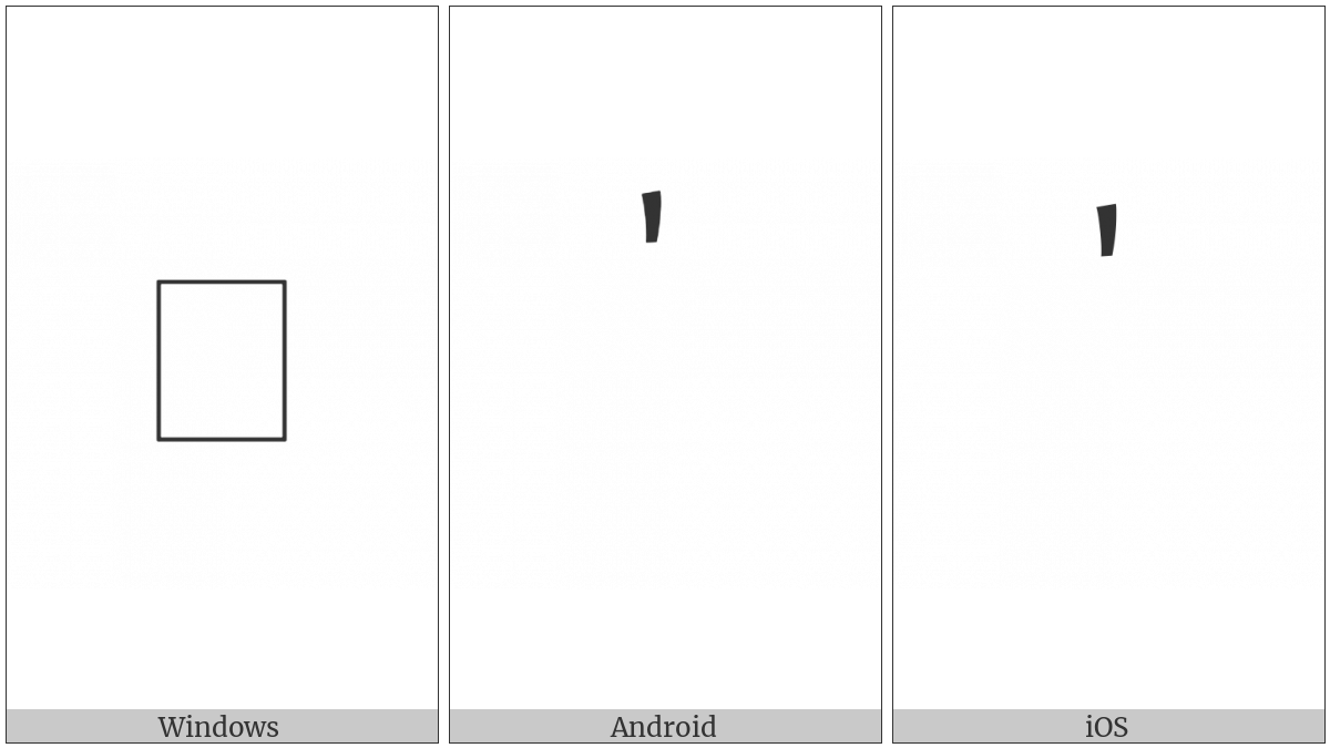 The image below shows how the “Samaritan Vowel Sign Aa” symbol might look like on different operating systems. If the font in which this web site is displayed does not contain the symbol and there is no fallback font able to render it, you can use the image below to get an idea of what it should look like.