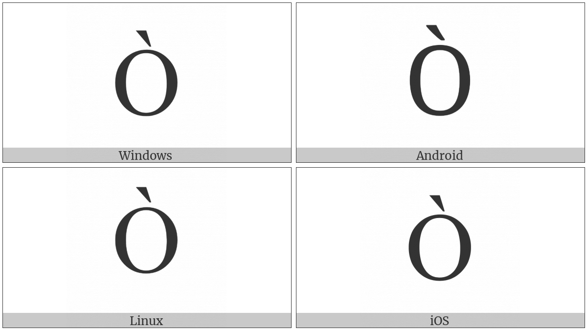 The image below shows how the “Latin Capital Letter O With Grave” symbol might look like on different operating systems. If the font in which this web site is displayed does not contain the symbol and there is no fallback font able to render it, you can use the image below to get an idea of what it should look like.