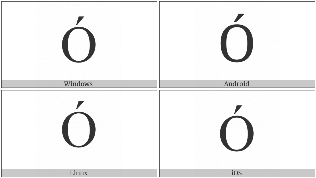 The image below shows how the “Latin Capital Letter O With Acute” symbol might look like on different operating systems. If the font in which this web site is displayed does not contain the symbol and there is no fallback font able to render it, you can use the image below to get an idea of what it should look like.