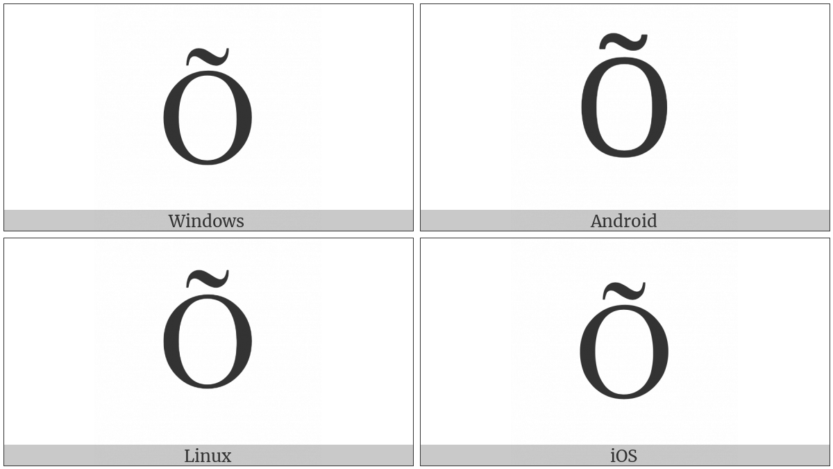 The image below shows how the “Latin Capital Letter O With Tilde” symbol might look like on different operating systems. If the font in which this web site is displayed does not contain the symbol and there is no fallback font able to render it, you can use the image below to get an idea of what it should look like.