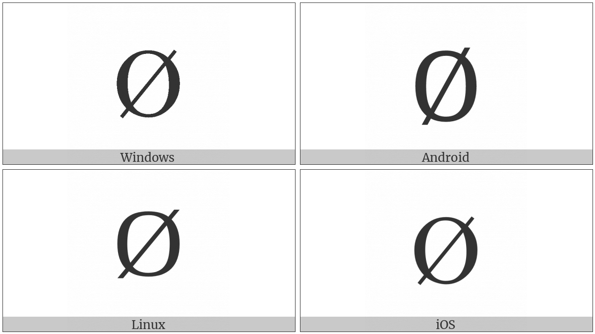 The image below shows how the “Latin Capital Letter O With Stroke” symbol might look like on different operating systems. If the font in which this web site is displayed does not contain the symbol and there is no fallback font able to render it, you can use the image below to get an idea of what it should look like.