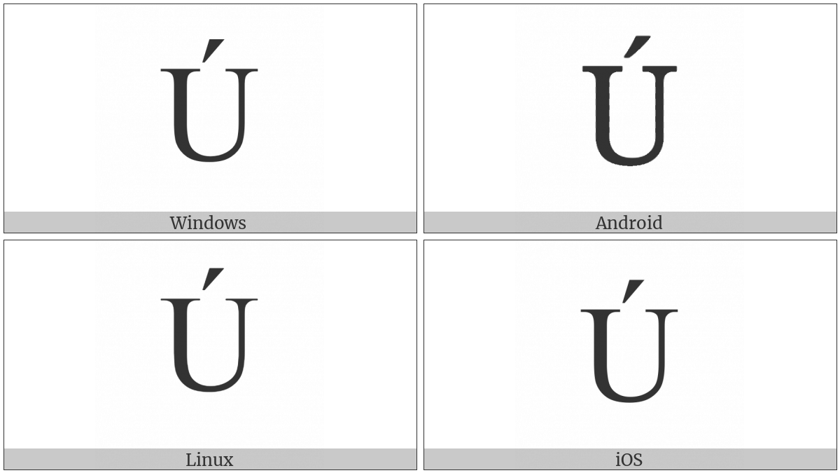The image below shows how the “Latin Capital Letter U With Acute” symbol might look like on different operating systems. If the font in which this web site is displayed does not contain the symbol and there is no fallback font able to render it, you can use the image below to get an idea of what it should look like.