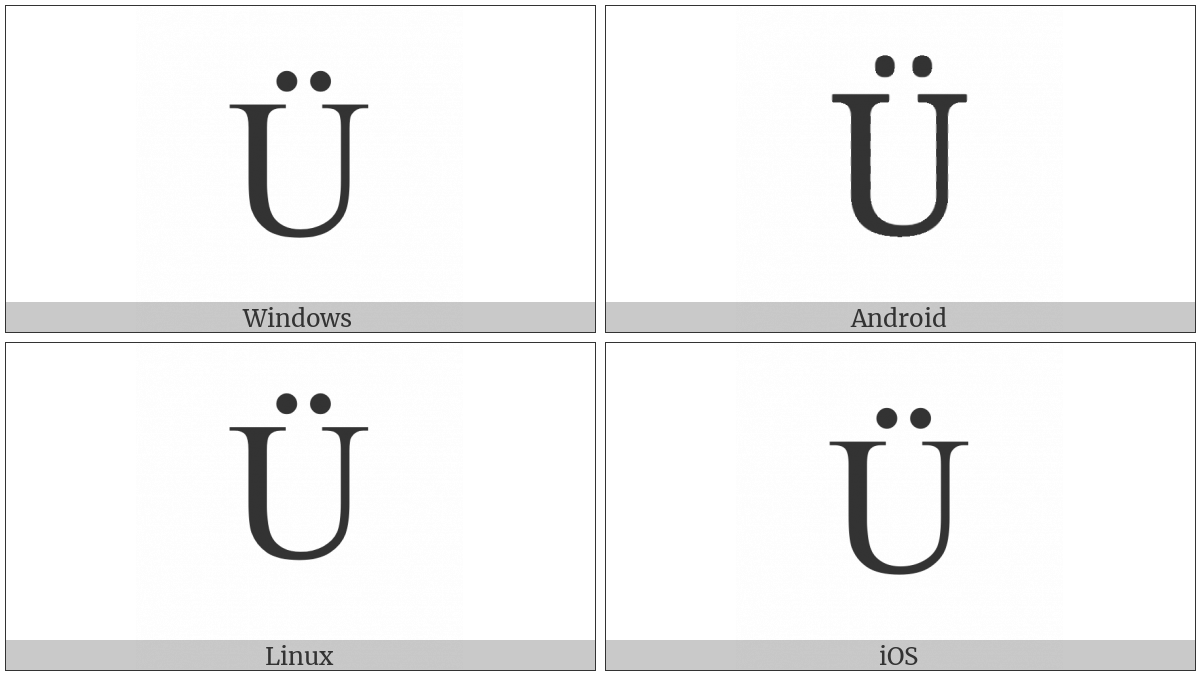 The image below shows how the “Latin Capital Letter U With Diaeresis” symbol might look like on different operating systems. If the font in which this web site is displayed does not contain the symbol and there is no fallback font able to render it, you can use the image below to get an idea of what it should look like.