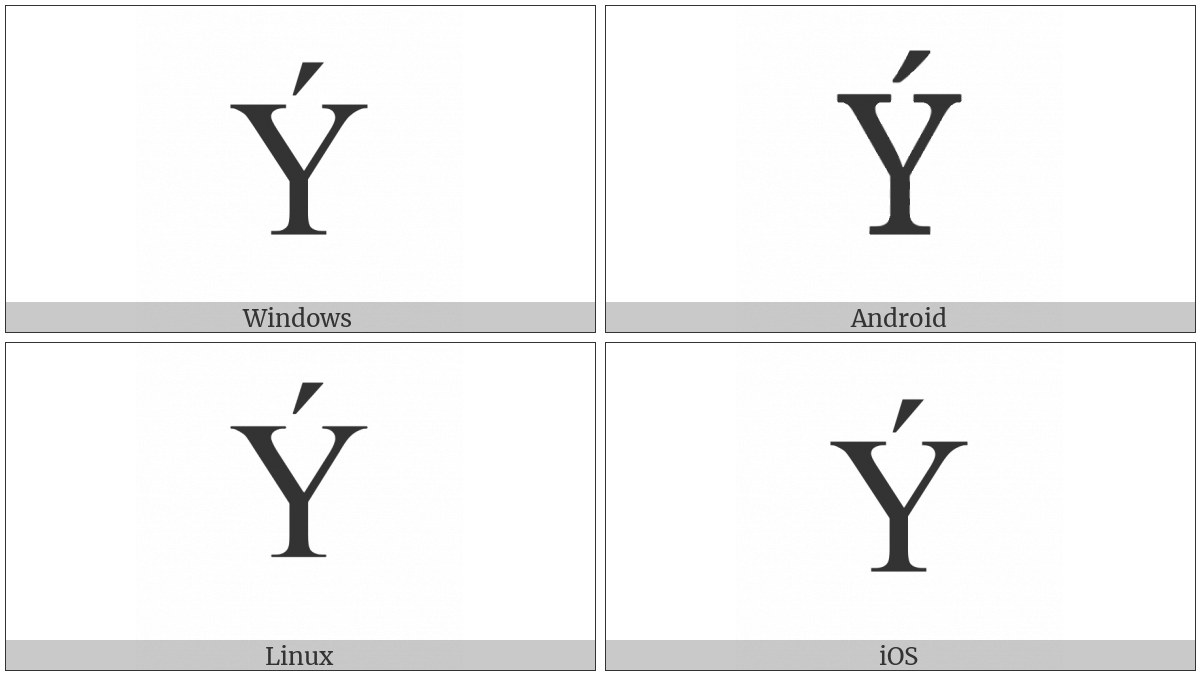 The image below shows how the “Latin Capital Letter Y With Acute” symbol might look like on different operating systems. If the font in which this web site is displayed does not contain the symbol and there is no fallback font able to render it, you can use the image below to get an idea of what it should look like.
