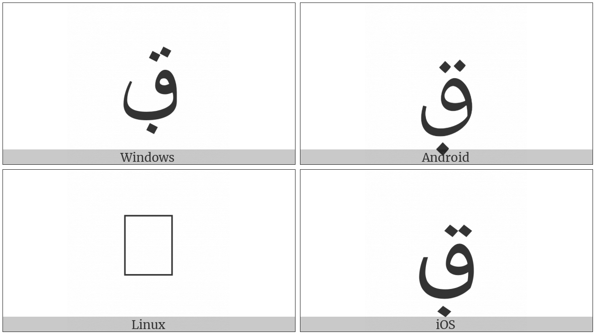The image below shows how the “Arabic Letter Qaf With Dot Below” symbol might look like on different operating systems. If the font in which this web site is displayed does not contain the symbol and there is no fallback font able to render it, you can use the image below to get an idea of what it should look like.