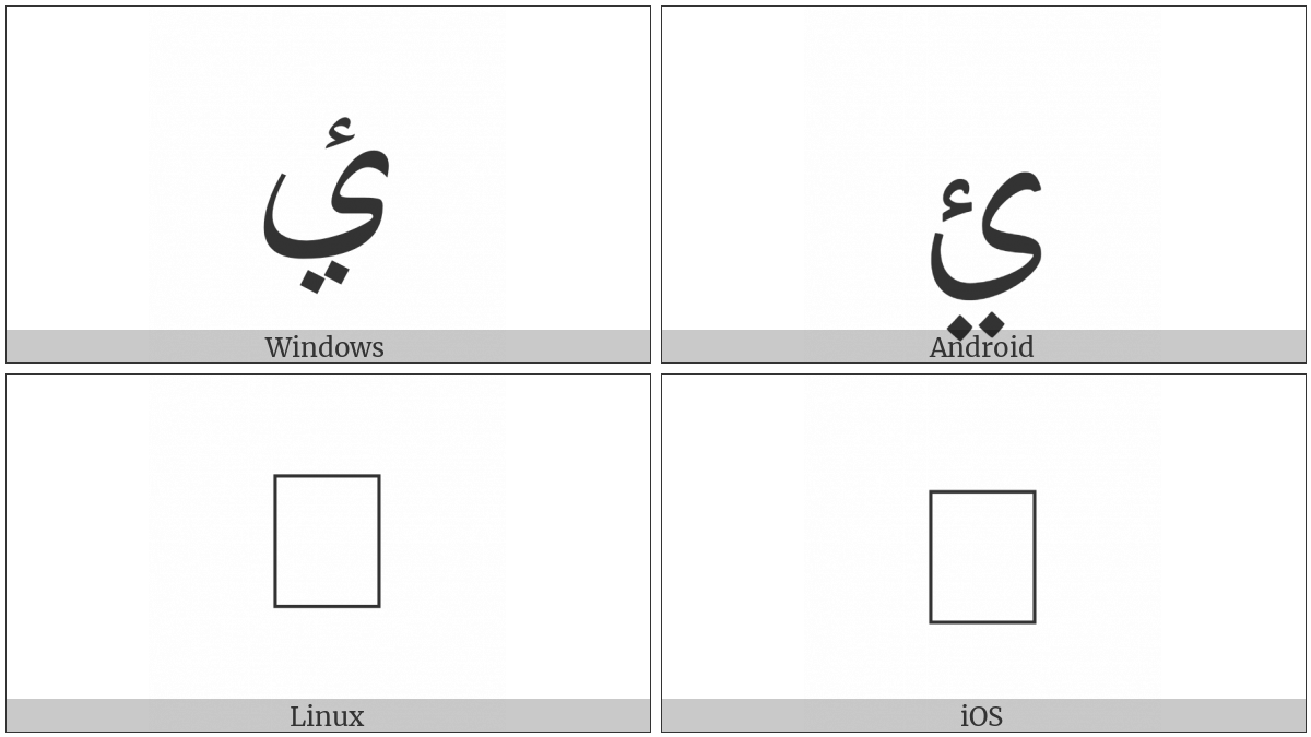 The image below shows how the “Arabic Letter Yeh With Two Dots Below And Hamza Above” symbol might look like on different operating systems. If the font in which this web site is displayed does not contain the symbol and there is no fallback font able to render it, you can use the image below to get an idea of what it should look like.