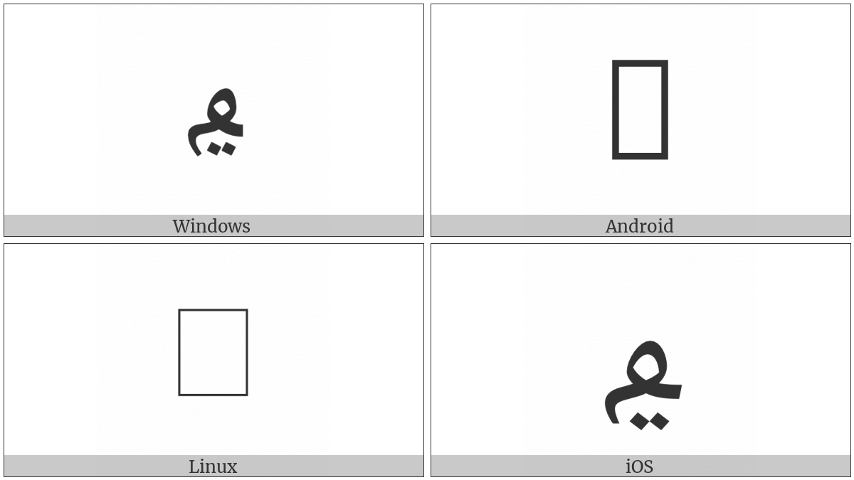 The image below shows how the “Arabic Letter Rohingya Yeh” symbol might look like on different operating systems. If the font in which this web site is displayed does not contain the symbol and there is no fallback font able to render it, you can use the image below to get an idea of what it should look like.