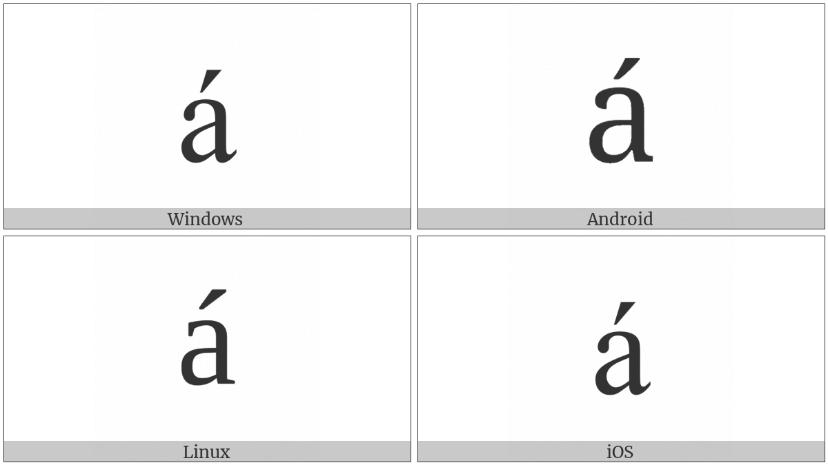 The image below shows how the “Latin Small Letter A With Acute” symbol might look like on different operating systems. If the font in which this web site is displayed does not contain the symbol and there is no fallback font able to render it, you can use the image below to get an idea of what it should look like.