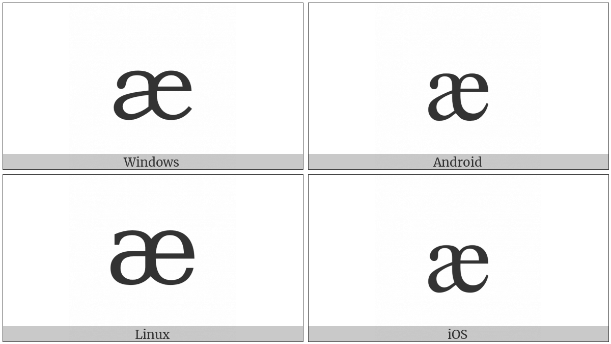 The image below shows how the “Latin Small Letter Ae” symbol might look like on different operating systems. If the font in which this web site is displayed does not contain the symbol and there is no fallback font able to render it, you can use the image below to get an idea of what it should look like.