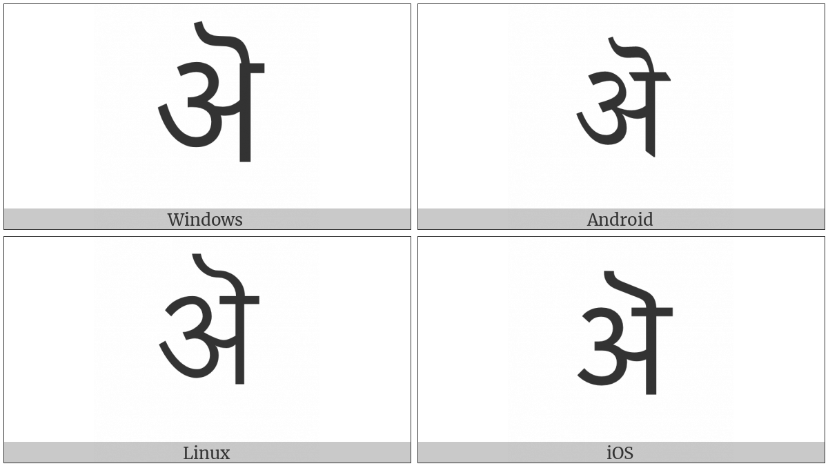 The image below shows how the “Devanagari Letter Short A” symbol might look like on different operating systems. If the font in which this web site is displayed does not contain the symbol and there is no fallback font able to render it, you can use the image below to get an idea of what it should look like.