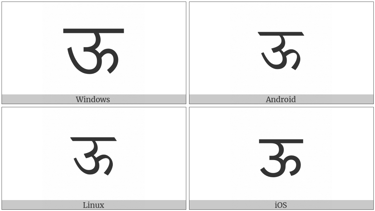 The image below shows how the “Devanagari Letter Uu” symbol might look like on different operating systems. If the font in which this web site is displayed does not contain the symbol and there is no fallback font able to render it, you can use the image below to get an idea of what it should look like.