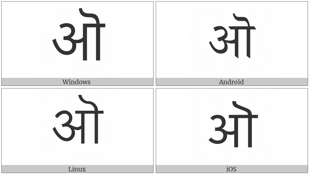 The image below shows how the “Devanagari Letter Short O” symbol might look like on different operating systems. If the font in which this web site is displayed does not contain the symbol and there is no fallback font able to render it, you can use the image below to get an idea of what it should look like.