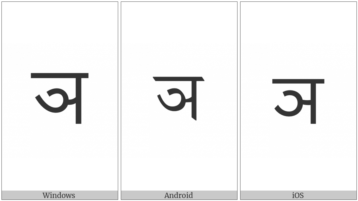 The image below shows how the “Devanagari Letter Nya” symbol might look like on different operating systems. If the font in which this web site is displayed does not contain the symbol and there is no fallback font able to render it, you can use the image below to get an idea of what it should look like.