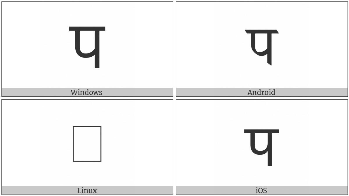 The image below shows how the “Devanagari Letter Pa” symbol might look like on different operating systems. If the font in which this web site is displayed does not contain the symbol and there is no fallback font able to render it, you can use the image below to get an idea of what it should look like.
