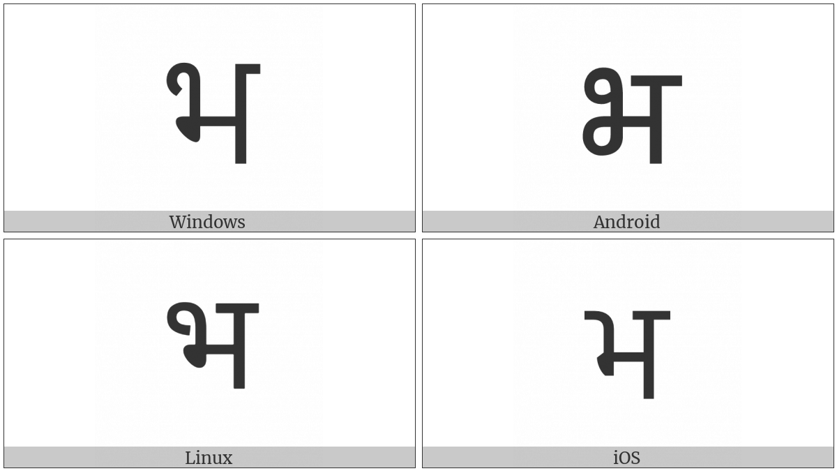 The image below shows how the “Devanagari Letter Bha” symbol might look like on different operating systems. If the font in which this web site is displayed does not contain the symbol and there is no fallback font able to render it, you can use the image below to get an idea of what it should look like.