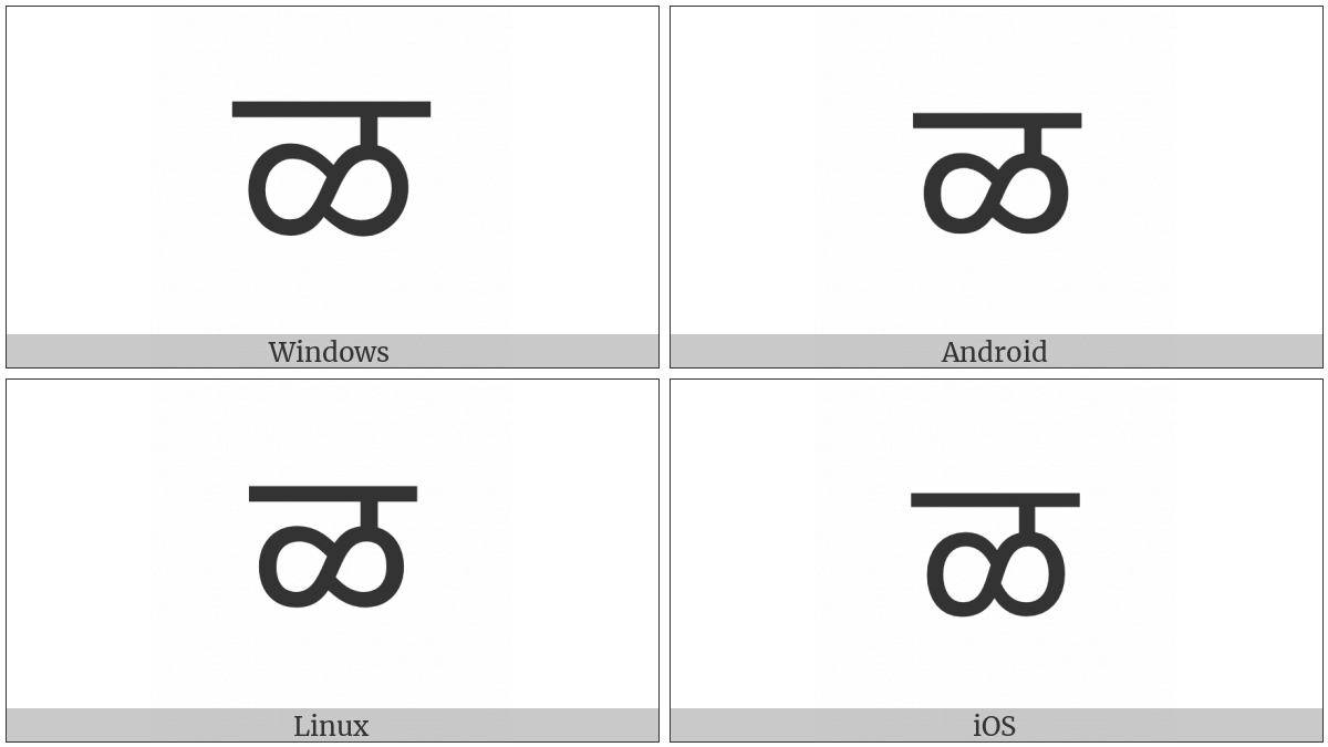 The image below shows how the “Devanagari Letter Lla” symbol might look like on different operating systems. If the font in which this web site is displayed does not contain the symbol and there is no fallback font able to render it, you can use the image below to get an idea of what it should look like.