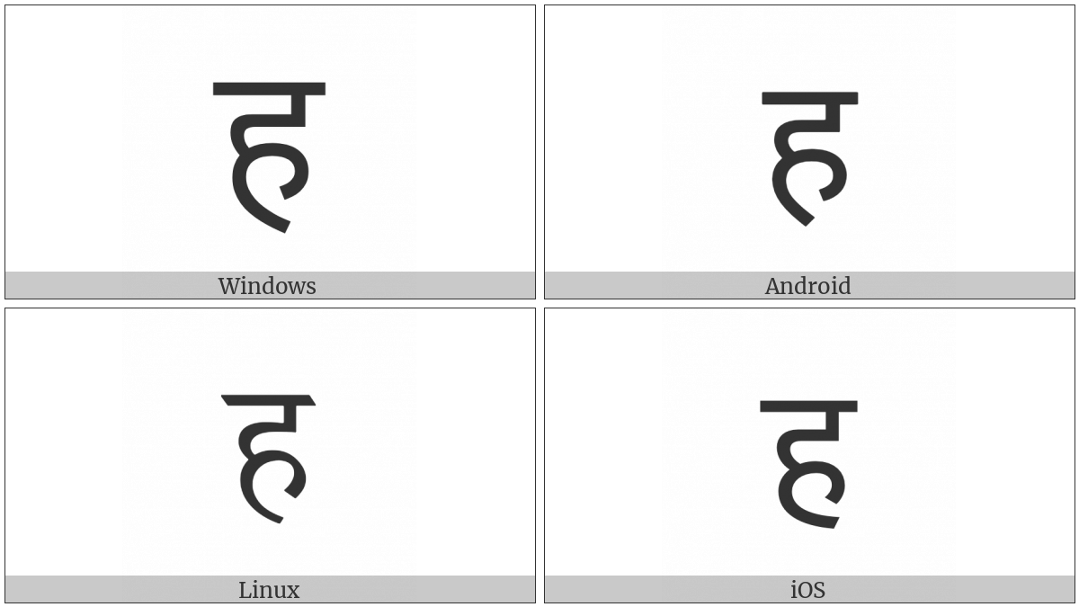 The image below shows how the “Devanagari Letter Ha” symbol might look like on different operating systems. If the font in which this web site is displayed does not contain the symbol and there is no fallback font able to render it, you can use the image below to get an idea of what it should look like.