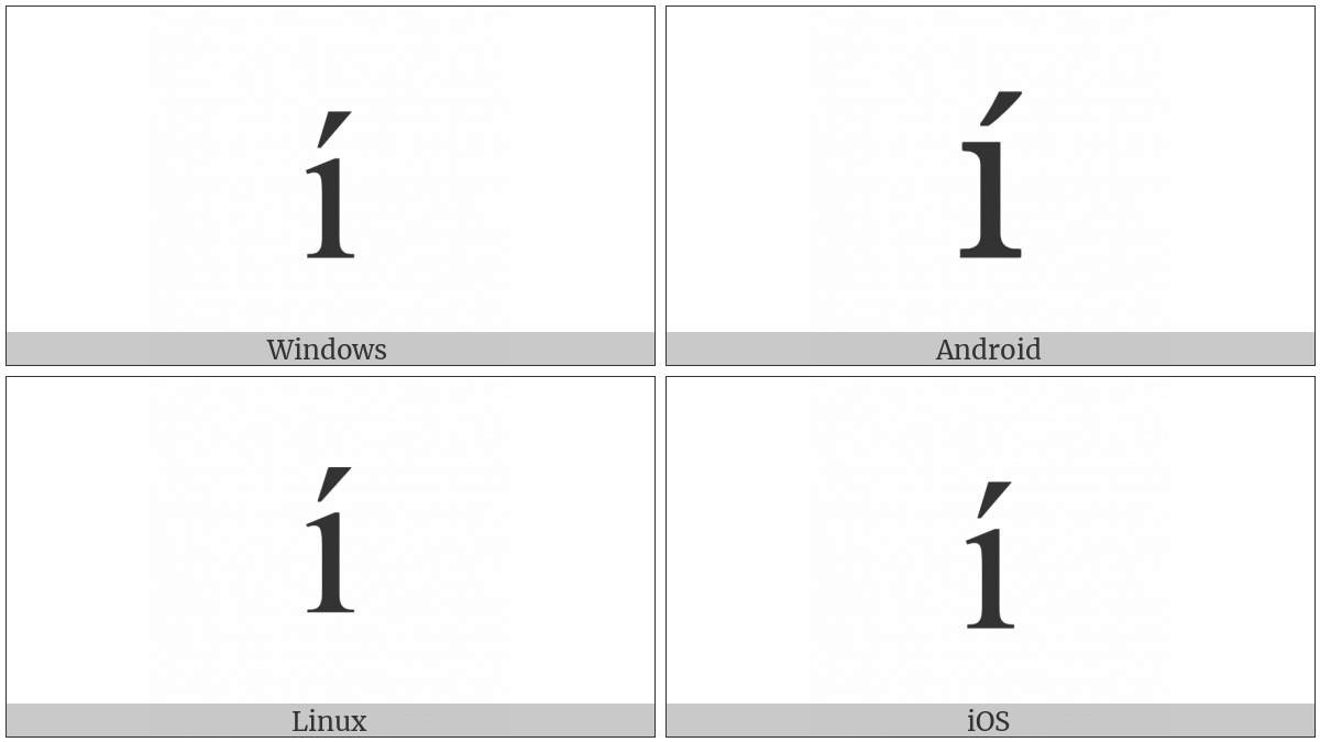 The image below shows how the “Latin Small Letter I With Acute” symbol might look like on different operating systems. If the font in which this web site is displayed does not contain the symbol and there is no fallback font able to render it, you can use the image below to get an idea of what it should look like.