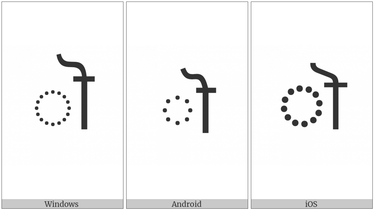The image below shows how the “Devanagari Vowel Sign Short O” symbol might look like on different operating systems. If the font in which this web site is displayed does not contain the symbol and there is no fallback font able to render it, you can use the image below to get an idea of what it should look like.