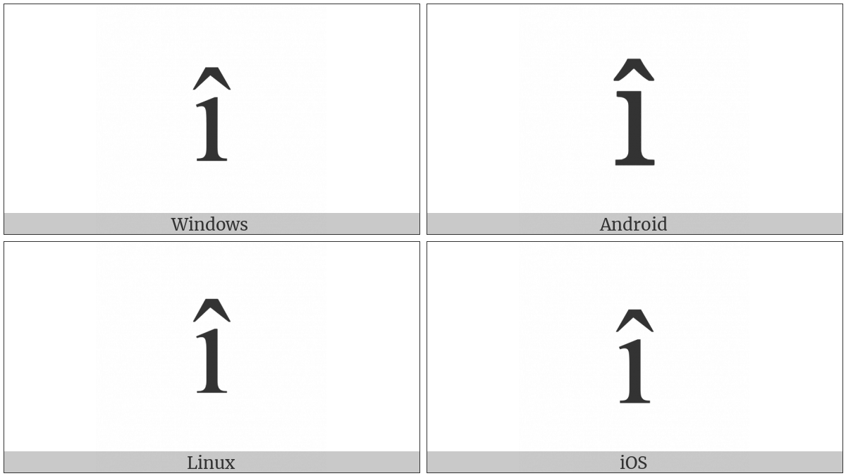 The image below shows how the “Latin Small Letter I With Circumflex” symbol might look like on different operating systems. If the font in which this web site is displayed does not contain the symbol and there is no fallback font able to render it, you can use the image below to get an idea of what it should look like.