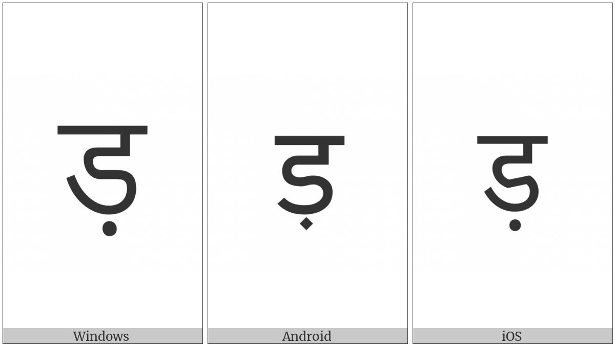 The image below shows how the “Devanagari Letter Dddha” symbol might look like on different operating systems. If the font in which this web site is displayed does not contain the symbol and there is no fallback font able to render it, you can use the image below to get an idea of what it should look like.