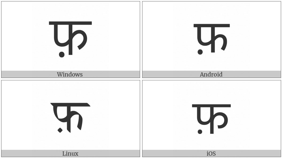 The image below shows how the “Devanagari Letter Fa” symbol might look like on different operating systems. If the font in which this web site is displayed does not contain the symbol and there is no fallback font able to render it, you can use the image below to get an idea of what it should look like.